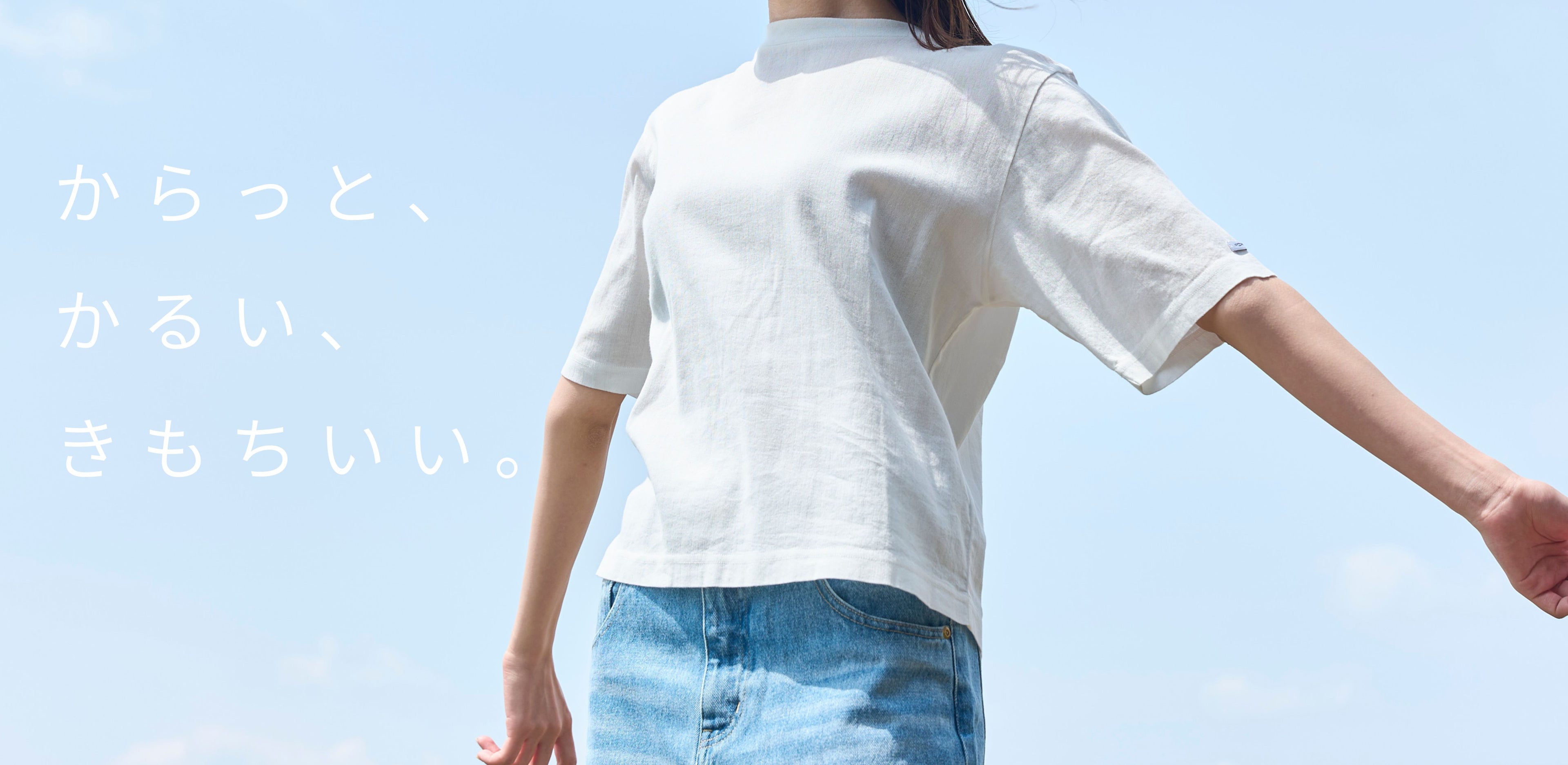 日本の伝統的な機能素材”ちぢみ”をベースに進化した織物は、からっと、かるい、きもちいい。