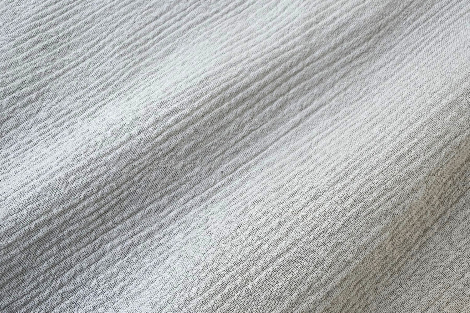 横方向に少しストレッチします。シワが目立ちにくいので、旅行など外出時に畳んで丸めたり肩掛けをして袖部分を結んだり、持ち運ぶのにも適しています。
