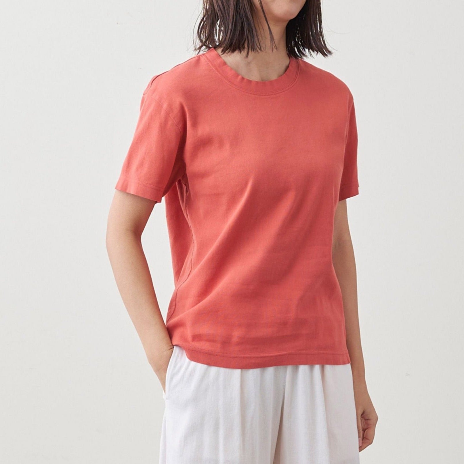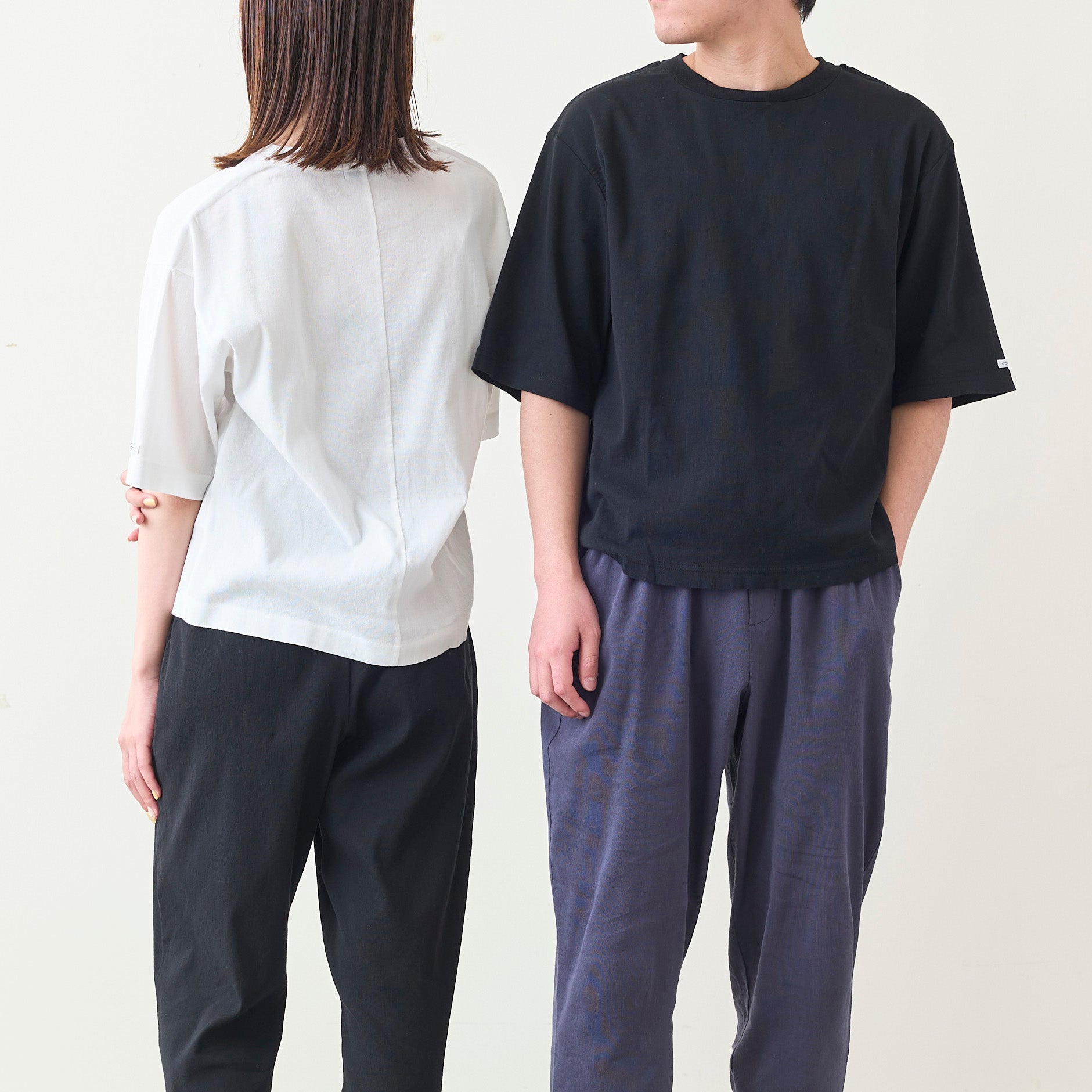 適度にゆとりがあるシルエット。首元をやや詰め、袖をすっきりめの5分袖にすることで全体的にシャープな印象を与えます。襟元は首後ろにバインダー始末による伸び止めを施し、袖口・裾まわりはしっかりしたTシャツ縫製の定番、Wステッチ仕様です。